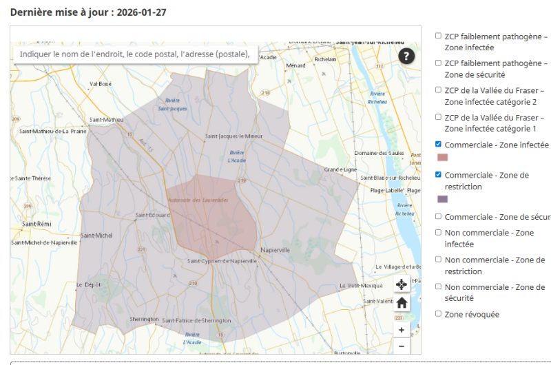 Au moins un cas de grippe aviaire H5N1 a été détecté à Saint-Jacques-le-Mineur, le 15 janvier. Une zone de contrôle primaire (ZCP) a été délimitée par l’Agence canadienne d’inspection des aliments (ACIA), afin de prévenir la propagation de la maladie.