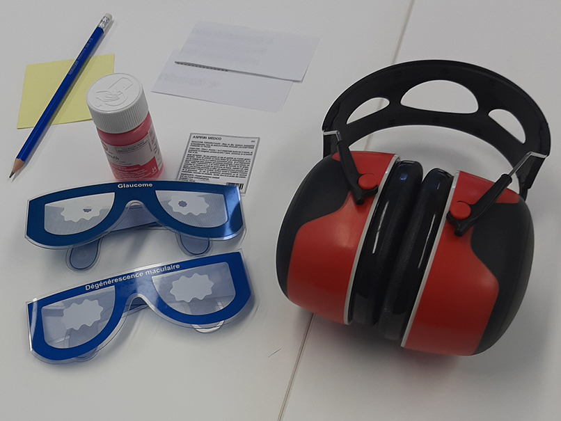 Au cours de l’atelier, les participants vont réaliser six tests de sensibilisation, qui simulent les difficultés rencontrées par les aînés au niveau de la vision, l’audition, la mobilité, l’agilité, la cognition et le deuil.