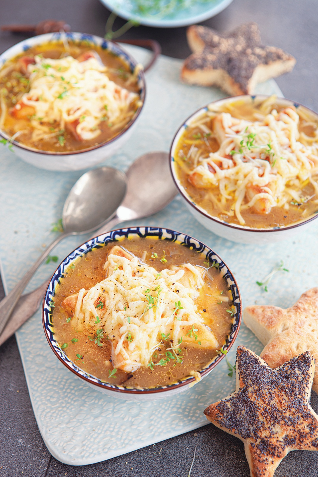 Verser la soupe dans 4 bols, puis déposer une étoile gratinée dans chacun d’entre eux.