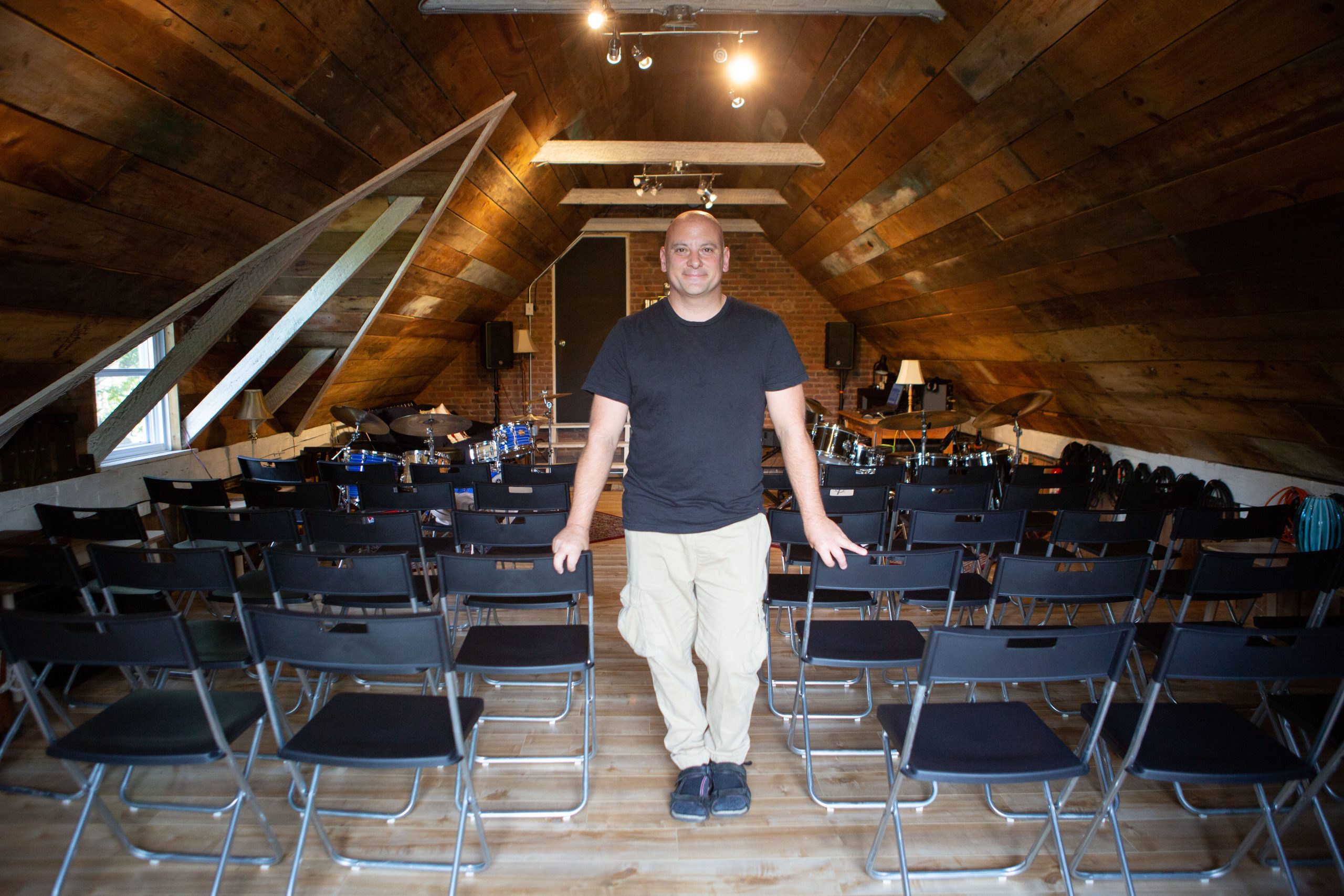 «Je voulais que ça looke comme ça et chaque planche a été récupérée de la grange originale, dit-il. Quand j’ai installé mon drum, j’ai eu l’impression de jouer dans un violon tellement le bois ajoutait aux vibrations. Il n’y a aucune fréquence agressante. C’est rond et ça sonne bien.»