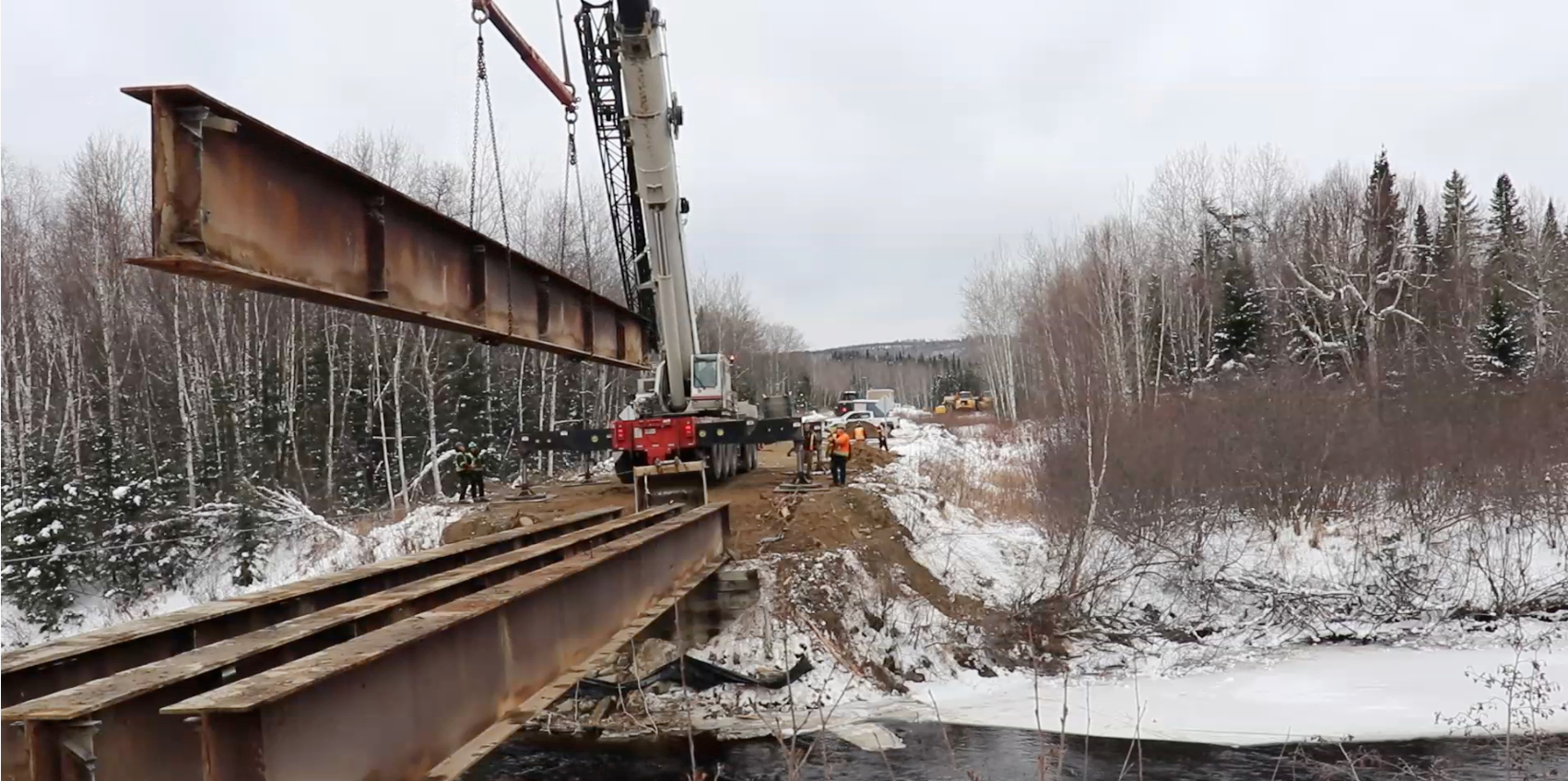 Ce pont a été acquis par un entrepreneur de Chibougamau qui avait besoin de franchir un fossé pour accéder à ses ressources en bois.